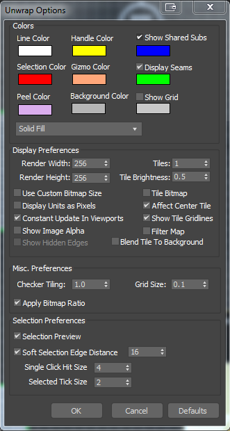 Set preferences for the Unwrap UVW modifier editor using controls on the Unwrap Options dialog.