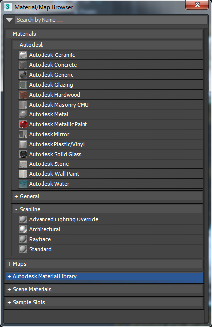 - The main part of the Material/Map Browser dialog is a scrollable list of materials and maps. This list is organized into groups that you can expand or collapse.