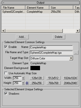 - Enter the file name of the rendered texture. Default=the object name followed by the element name, and TGA format.