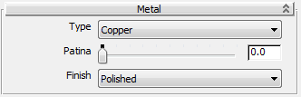 Lets you set a patina for Copper or Bronze. The higher the value, the more the amount of patina. Range: 0 to 1.0. Default=0.0.