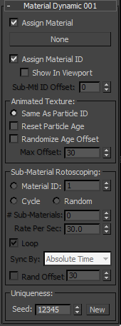 - Assigns the same material ID to a particle as its particle ID. Choose this when using a material containing an animated texture, such as a Bitmap, Particle Age, or Particle MBlur map.