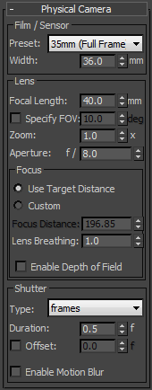 - Chooses the model of film or charge-coupled sensor. The choices are 35mm (Full Frame) film (the default), and a variety of industry-standard sensor settings. Each setting has its default Width value. The Custom choice is for choosing an arbitrary Width.