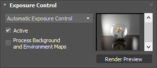 - The thumbnail displays a preview of the rendered scene with the active exposure control applied. Once a preview has been rendered, it updates interactively as you change exposure control settings.