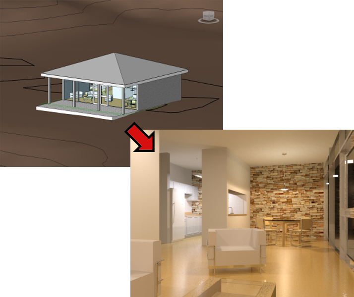 A house model created in Revit becomes a detailed rendering in 3ds Max