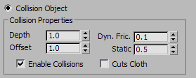 The distance maintained between the cloth object and the collision object. A very low value can cause the collision mesh to protrude out from under the cloth. A very high value will look like the fabric is floating on top of the collision object. This value is measured in 3ds Max units.