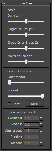 In Populate, an idle area is a surface on which simulated people "hang out" by themselves or interact with others. Visible features include circles that show groups of people talking, and markers that show each character's position, starting orientation, and gender: red for female and blue for male.