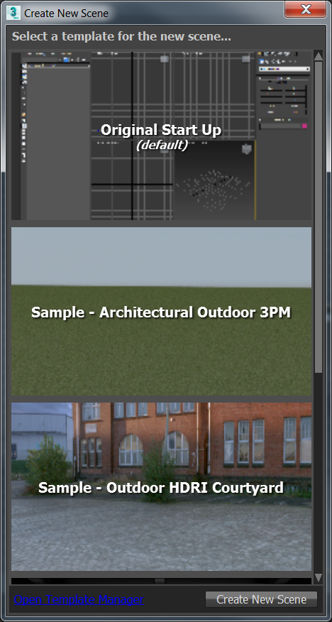 The template manager lets you choose from a variety of scene setups, to help you get started with work on a new scene.