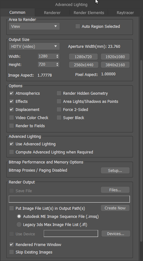 • Rendering menu > Render Setup > Render Setup dialog > Common panel > Common Parameters rollout
