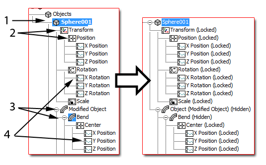Left: Before locking; Right: After locking and then unlocking the Sphere001 track