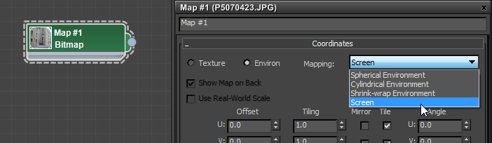 Background panel is not already open, open it and make sure Aspect Ratio is set to Match Rendering Output (this is the default choice). - Use the Material Editor to change the map's Mapping type to Screen.
