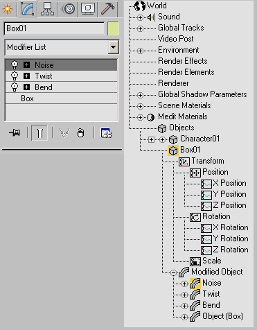 The method of evaluating all modifiers first and then evaluating the combined transforms has ramifications for the way you work with 3ds Max. The effect of transforms is independent of the order in which they are applied. The order in which you apply modifiers, on the other hand, does affect the resulting geometry. If you want to apply a transform that is evaluated in a specific order in the modifier stack, use the XForm modifier.