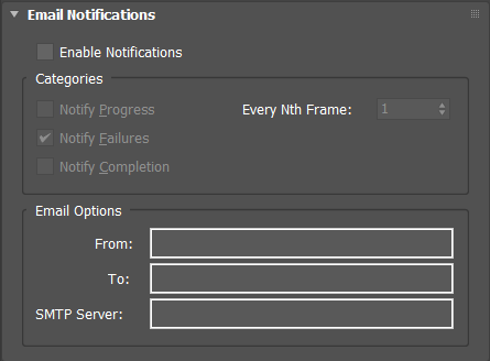 - Sends emails to indicate rendering progress. An email is sent every time the number of frames specified in Every Nth Frame has completed rendering. Default=off.