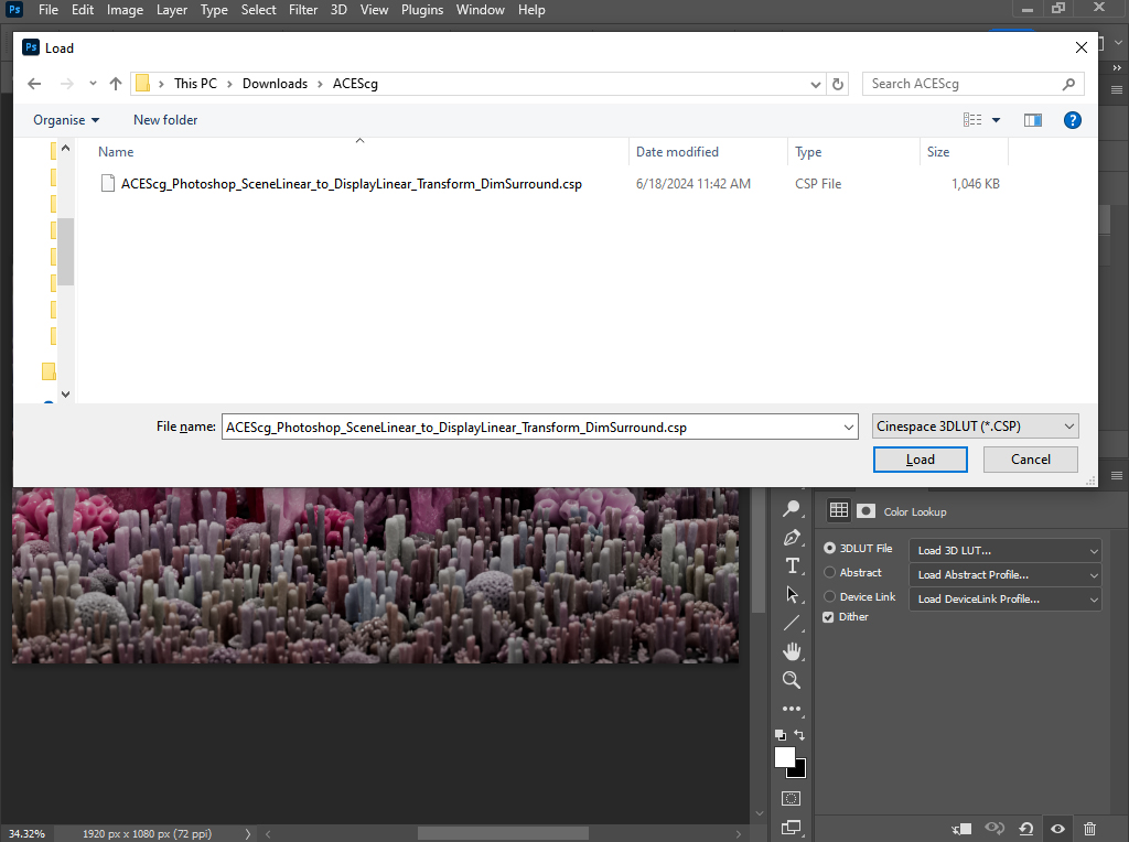 - Navigate to ACEScg_Photoshop_SceneLinear_to_DisplayLinear_Transform_DimSurround.csp