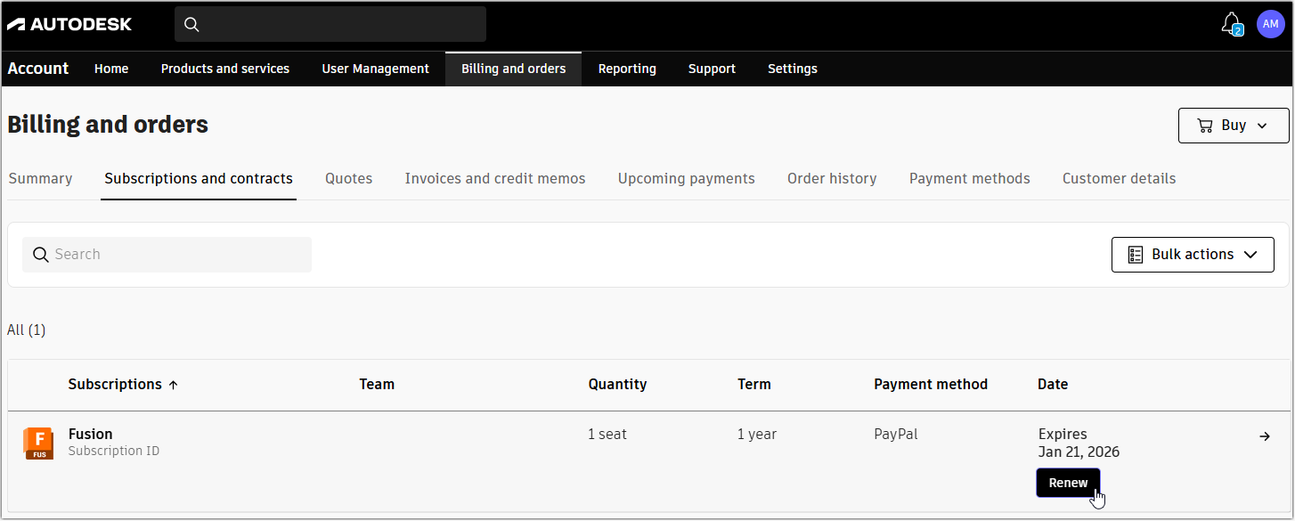 - Go to your Autodesk account > Billing and orders.
