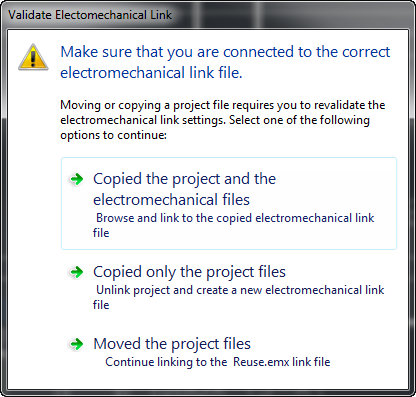 - In the Validate Electromechanical Link task dialog box, select the appropriate option to validate your electromechanical link settings for the copied project.