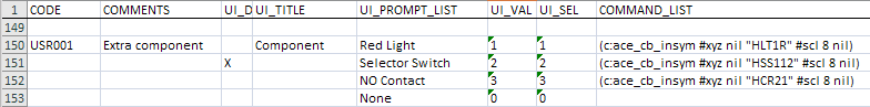 - Enter X in the UI_DEF field in this row. It defines the entry as the default option. The default is used when the circuit is inserted using the Insert button on the Circuit Selection dialog box. If the Configure button is selected, the "X" entry is the preselected default in the Circuit Configuration dialog box when the options for this marker block are displayed