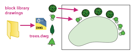 One or more block definitions contained within a drawing file. For example, you can create a drawing that only contains block definitions of trees. You can then insert any of these blocks from that drawing into your current drawing. A drawing file that contains related blocks is commonly termed a block library drawing.