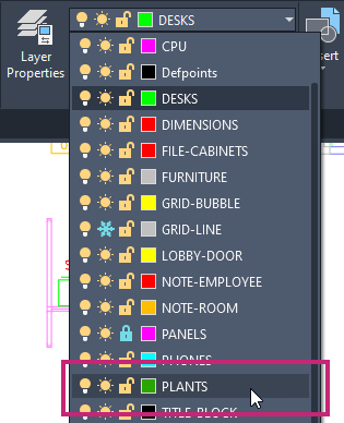 On the ribbon, click Home tab > Layers panel > Layers drop-down list and choose PLANTS.