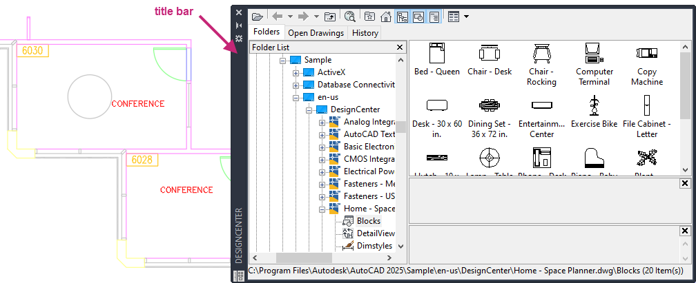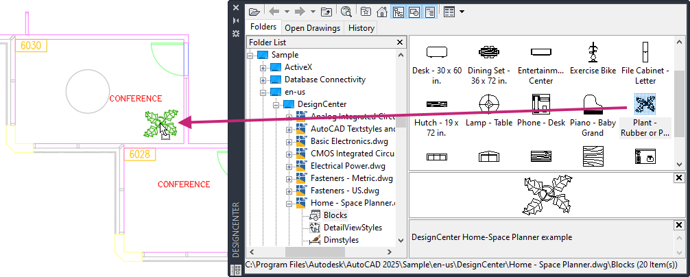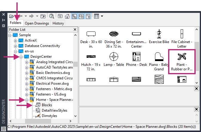 In the Folders tree view, left-side of the palette, click the + next to the DesignCenter folder and then the Home - Space Planner.dwg file. Select the Blocks node under the Home - Space Planner.dwg file.