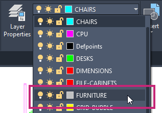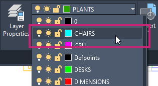 On the ribbon, click Home tab > Layers panel > Layers drop-down list and choose CHAIRS.