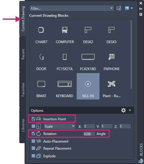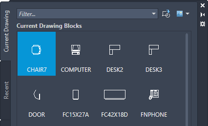 These block insertion tools allow you to insert block definitions created within the current drawing as well as insert drawing files stored on your local workstation or a shared network location.