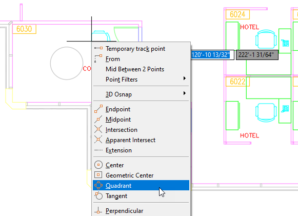 Tip:Press the F3 key to toggle running object snaps on or off. Turning off running object snap will making placement easier.