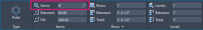 Click Array Creation contextual tab > Items panel, click in the Items text box and change the value to 4, and then press Enter.