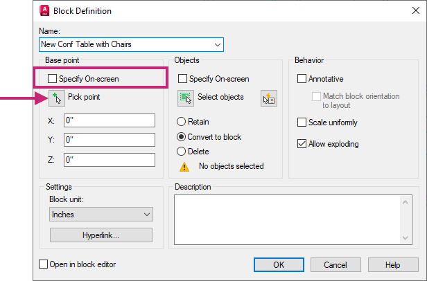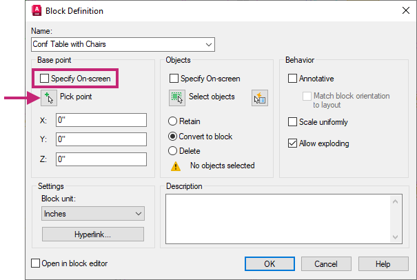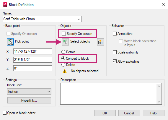 In the Block Definition dialog box, Name text box, type Conf Table with Chairs.