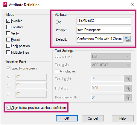In the Attribute Definition dialog box, match the options and values in the following image: