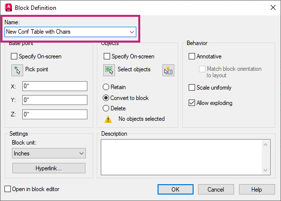 In the Block Definition dialog box, Name text box, type New Conf Table with Chairs.
