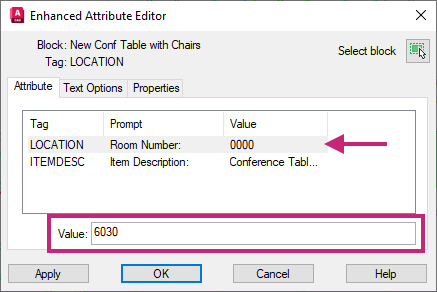 In the Enhanced Attribute Editor dialog box, select the LOCATION tag and replace the current value with 6030.