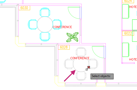 At the Select objects: prompt, select the block with the 4 chairs in the second conference room, labeled 6028, and press Enter.