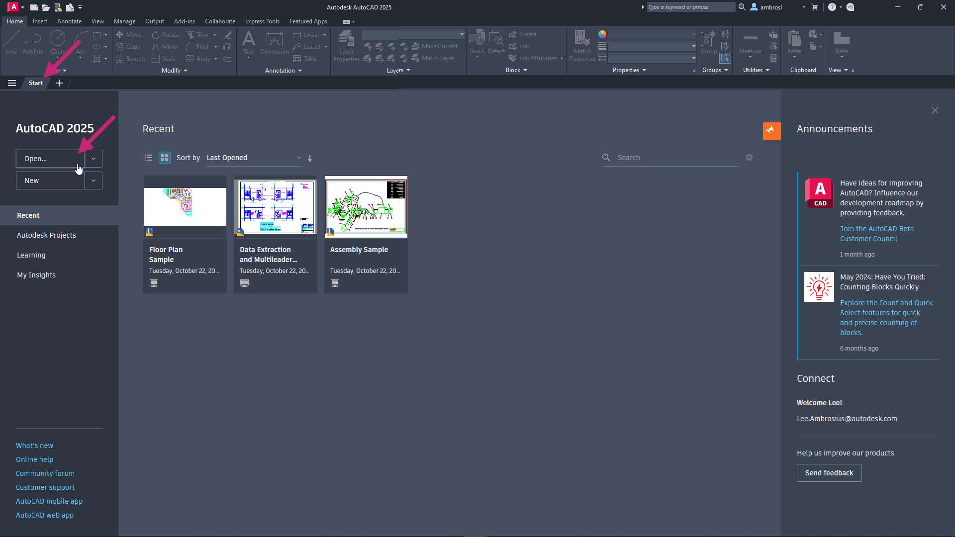 Open a sample drawing file that will be used for the remainder of the exercises.On the Start tab, click Open.