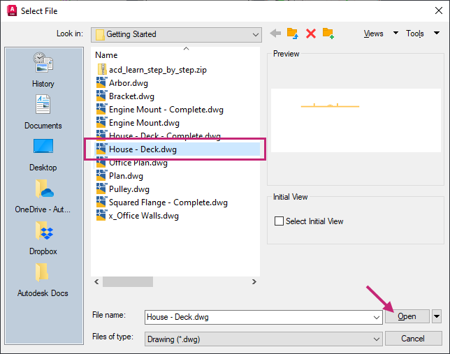 In the Select File dialog box, browse to the sample files you previously downloaded and select the House - Deck.dwg file. Click Open.