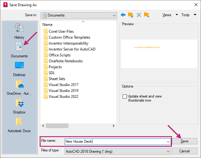 In the Save Drawing As dialog box, browse to the Documents folder.