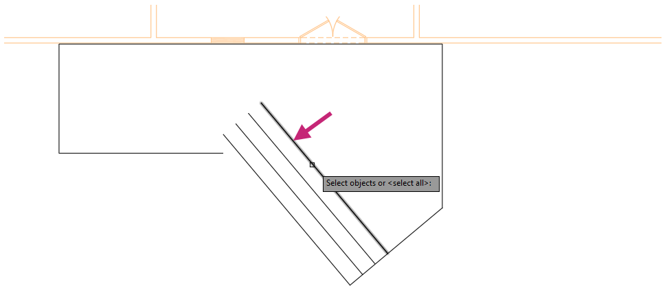 At the Select objects or <select all>: prompt, select the right-most angled line you created by offsetting as shown in the following image and press Enter to end object selection.