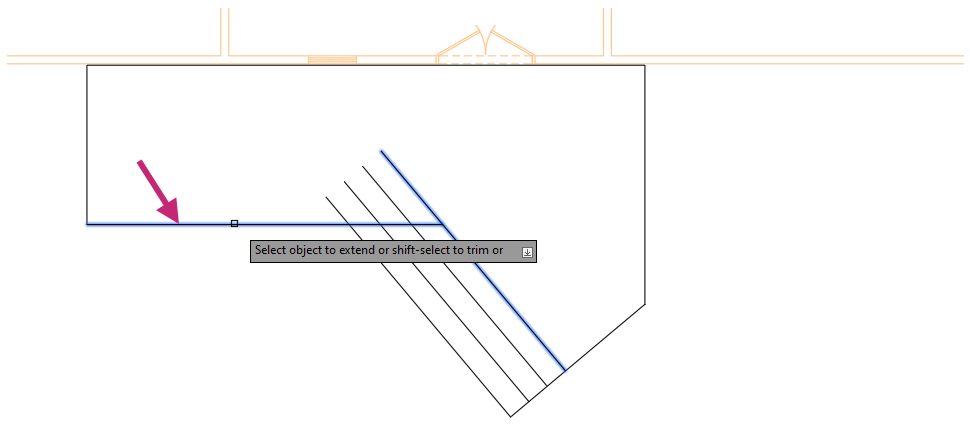 At the Select object to extend or shift-select to trim or [Boundary edges/Crossing/mOde/Project]: prompt, select the horizontal line as shown in the following image and press Enter to end object selection.