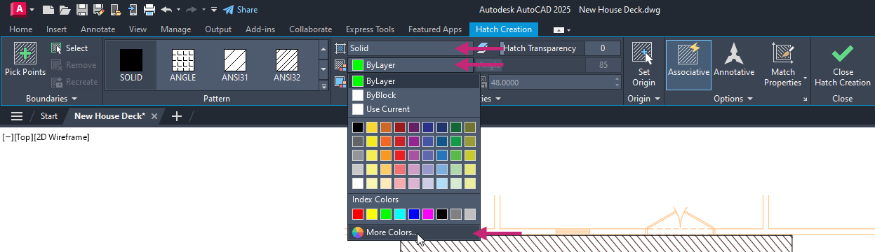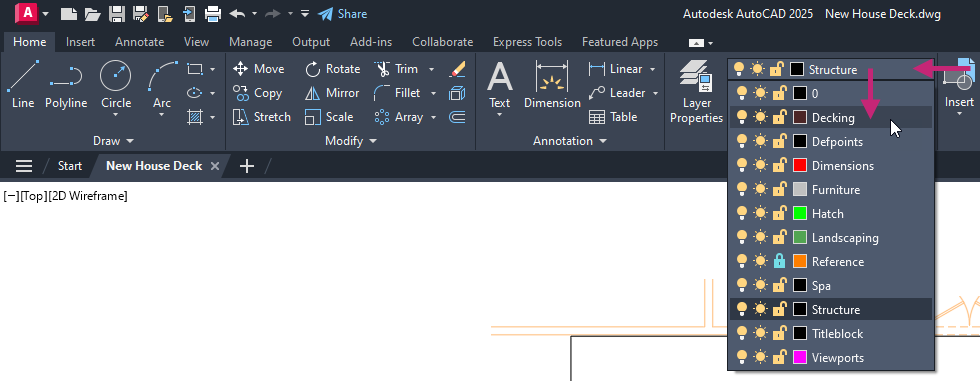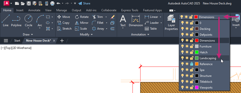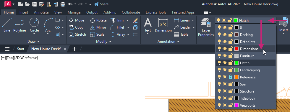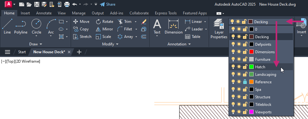 Apply hatch patterns and fills to enhance the visualization of the deck.- On the ribbon, click Home tab > Layers panel > Layers drop-down list and choose Decking.Find