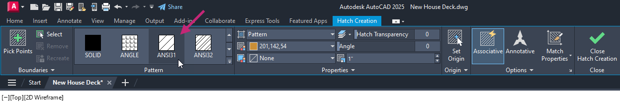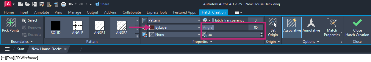 On the Hatch Creation contextual tab > Properties panel, do the following: