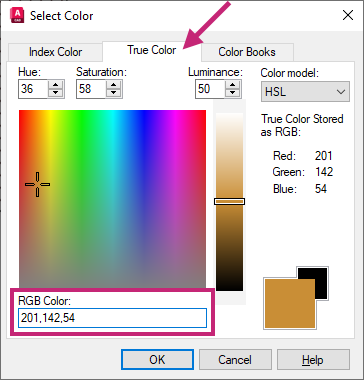 In the Select Color dialog box, True Color tab, click in the RBG/Color text box and replace the value with 201,142,54. Click OK.