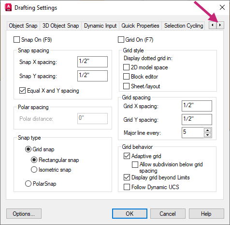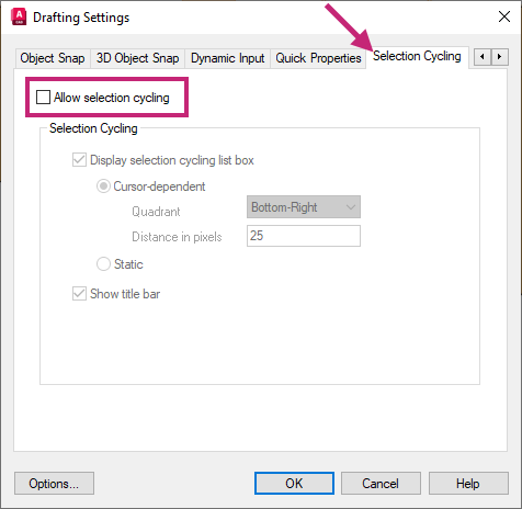 In the Drafting Settings dialog box, click the right arrow adjacent to the tabs until you see the Selection Cycling tab.