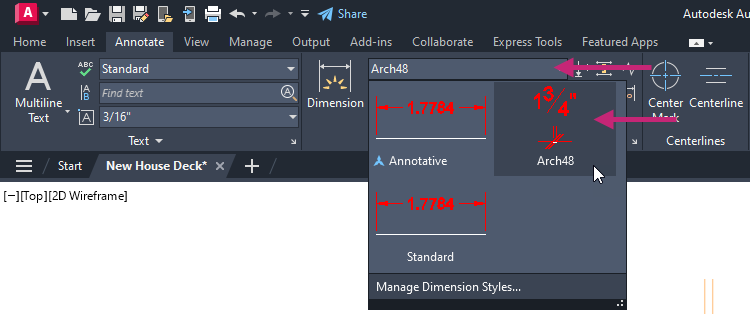 Click Annotate tab > Dimensions panel > Dimension Styles drop-down list and choose Arch48.