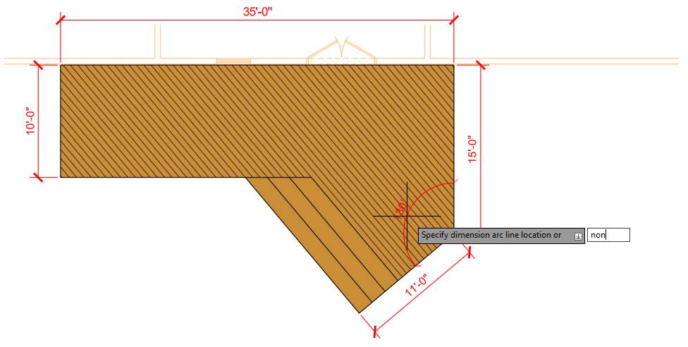 At the Specify dimension arc line location or [Mtext/Text/Angle/Quadrant]: prompt, enter non and specify a point inside of the deck.
