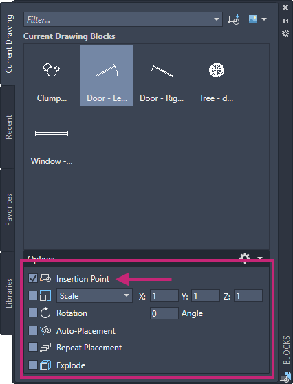 On the Blocks palette, under the Options section, clear all check boxes except for Insertion Point and click Insertion Point, if it is not already checked.