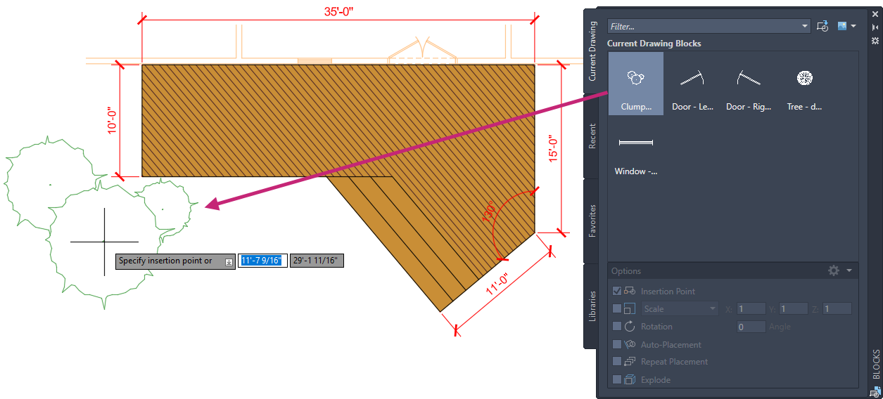 At the Specify insertion point or [Basepoint/Scale/Rotate]: prompt, specify two points to the right of the deck.