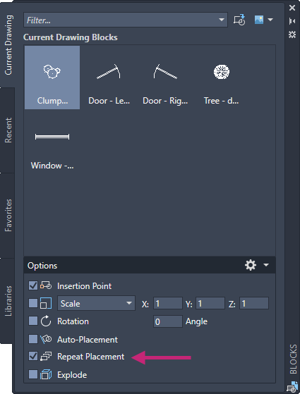 On the Blocks palette, under the Options section, click Repeat Placement.