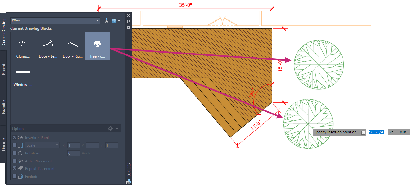 On the Blocks palette, Current Drawing tab, click Tree - deciduous - plan.