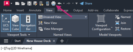 Plot/print the deck design to a PDF file so that others without AutoCAD access can see the design.- On the Quick Access toolbar, click Plot.Find