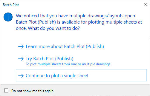 If the Batch Plot task dialog box is displayed, click Continue to Plot a Single Sheet.
