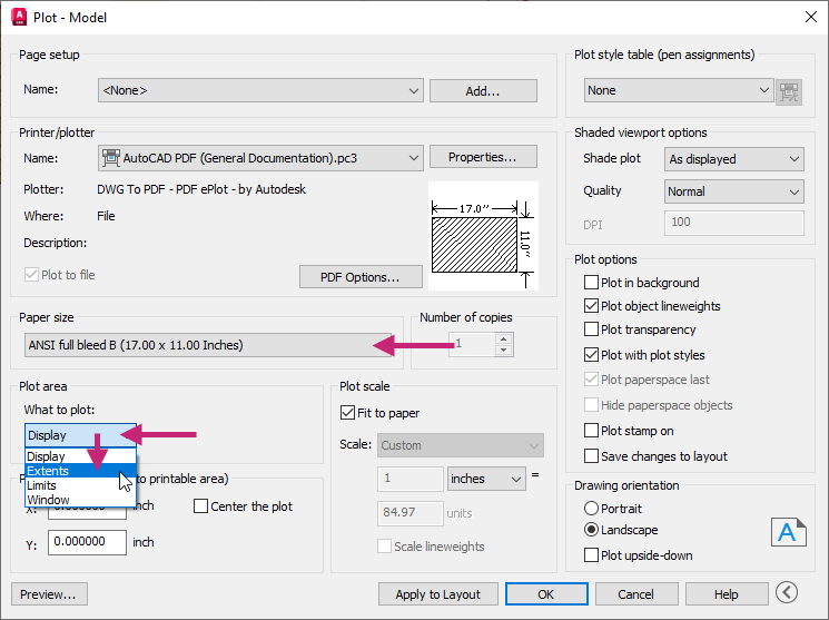 In the Plot - Model dialog box, under Printer/Plotter, click the Name drop-down list and choose AutoCAD PDF (General Documentation).pc3.